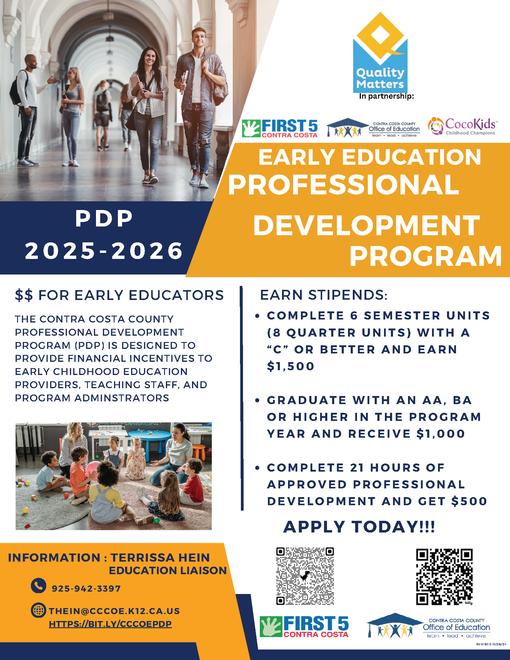 If you are an early learning educator who works with children birth to age 5 in Contra Costa County, you may be eligible for a stipend for completing college coursework or trainings that help you learn more about early childhood education. If you complete your Associate degree or higher during the program you may be eligible to receive an additional stipend in recognition of that professional and educational milestone.